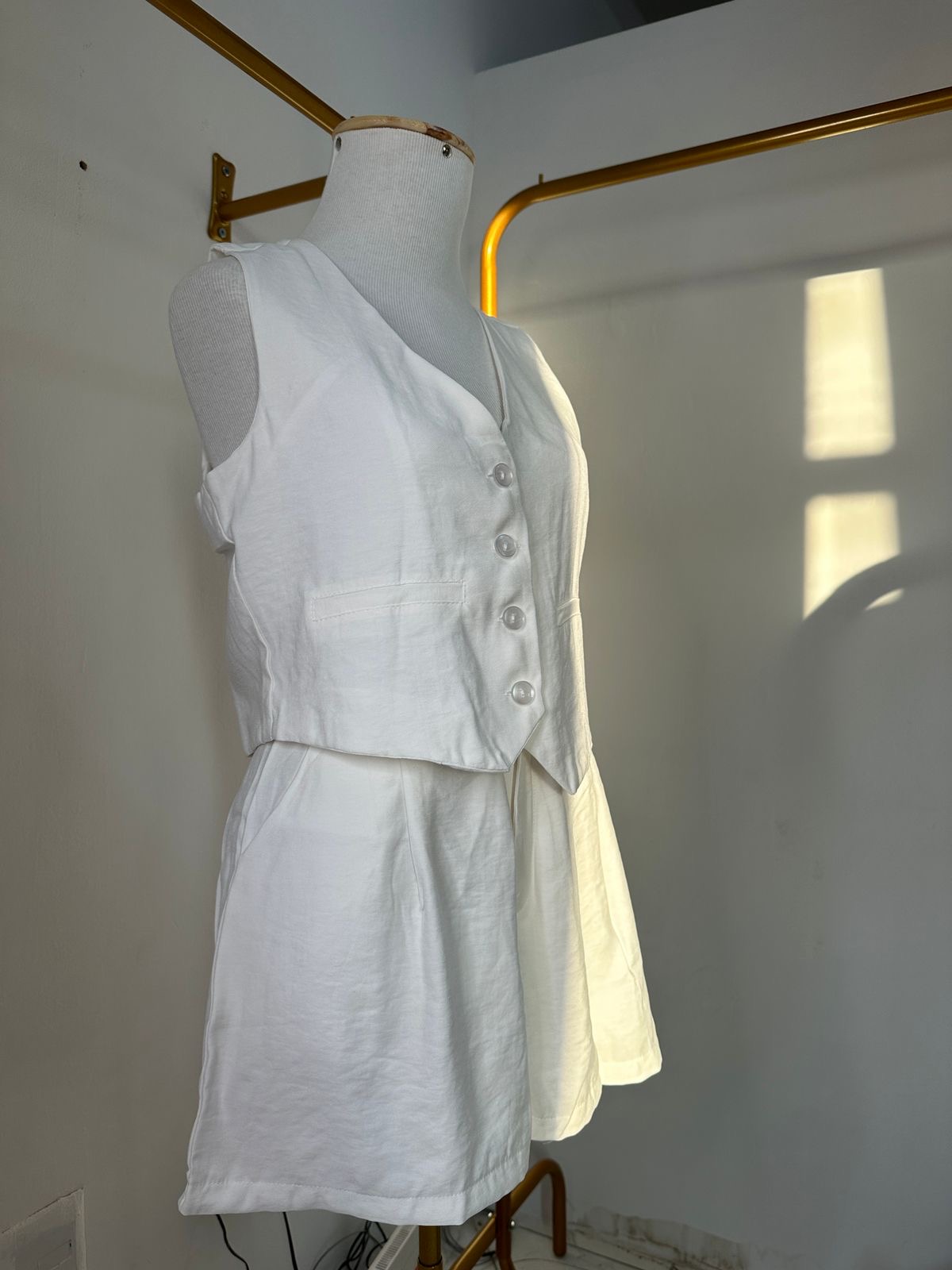 Conjunto moderno e sofisticado, composto por colete com 4 botões e um short de alfaiataria que traz elegância e conforto. O colete possui um caimento estruturado e versátil, ideal para compor looks estilosos em qualquer ocasião.